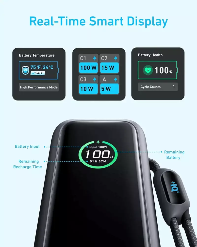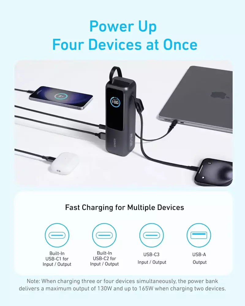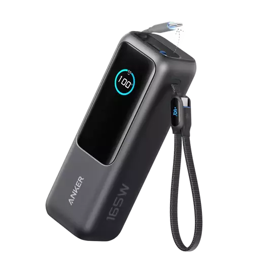 Turbo Point | شاحن متنقل 25K بقوة 165 واط مع كيبل قابل للسحب ومدمج – 25K 165 واط من Anker | أسود